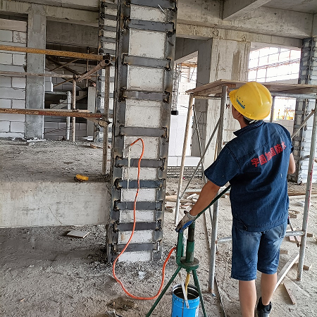 包鋼加固工藝是將鋼板和角鋼外包于混凝土構件的表面,砼鋼之間以包鋼灌注膠填充,利用鋼板良好的抗拉、壓性能及膠液優(yōu)異的粘結強度,使鋼板與原混凝土構件能協(xié)同工作(鋼板實際上起到與構件受拉壓鋼筋同樣的作用),達到增強構件承載力及剛度的目的。