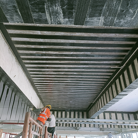 碳纖維加固碳纖維膠將碳纖維粘貼在混土構(gòu)件表面,使混凝土與碳纖維片形成一體,形成復(fù)合材料體,通過其與結(jié)構(gòu)或構(gòu)件的協(xié)同工作,達(dá)到對結(jié)構(gòu)構(gòu)件補(bǔ)強(qiáng)加固及改善受力性能的目的,以此提高樓板承重。